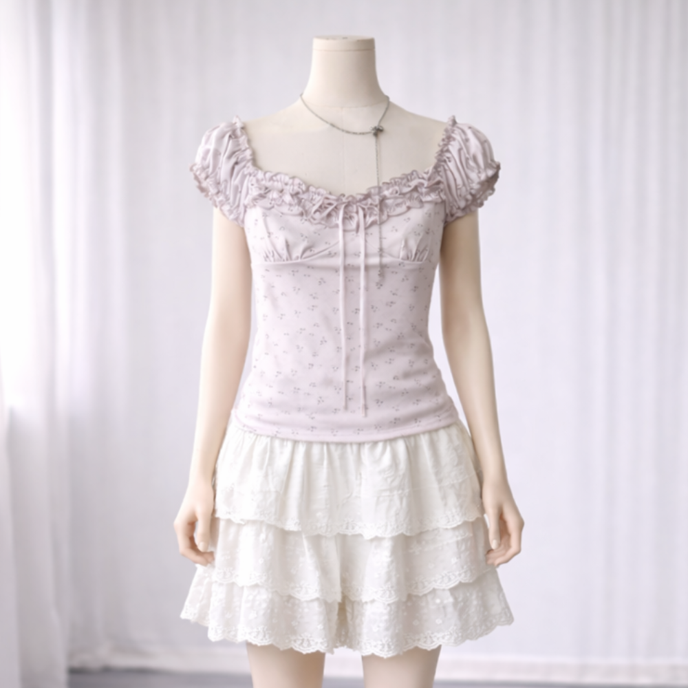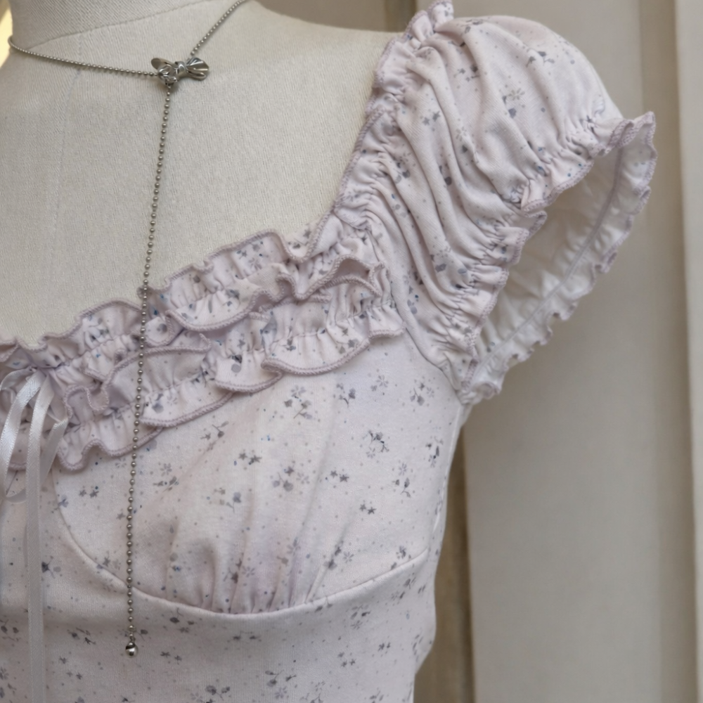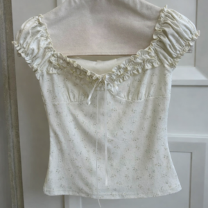 - Tay ngắn bo chun, viền bèo nhún xinh xắn, tạo cảm giác mềm mại